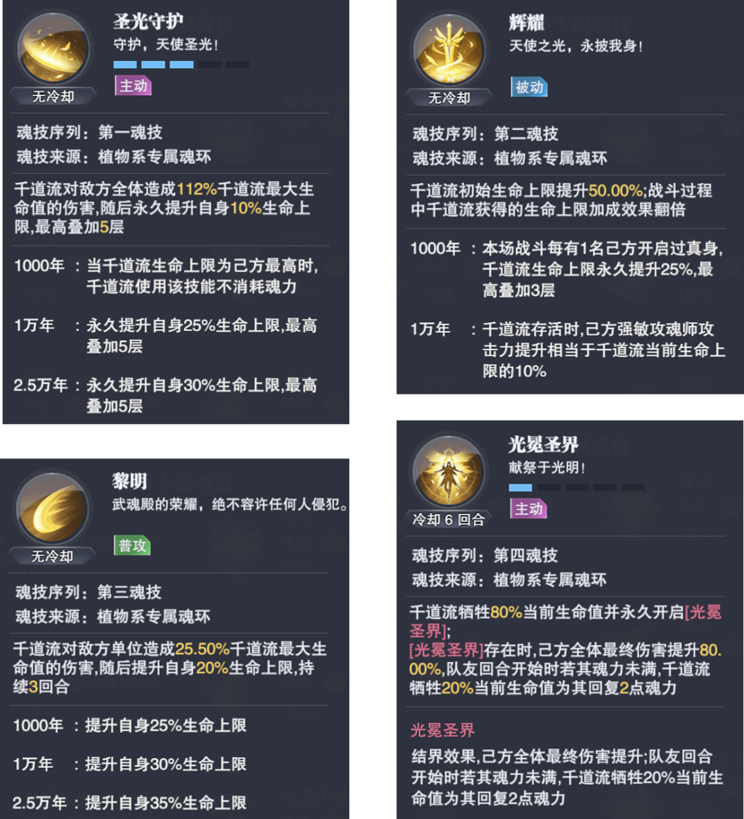 所以SP千道流的长图核心能力就是依靠自身生命上限的一定比例来为己方强敏攻魂师提供增伤,且还有永久存在的4技能圣界可以大幅提供增伤、回能等效果。不过这里经过实测后发现,SP千道流在吃到SP宁荣荣【神佑】的生命属性提升效果后,其并没有表现出理论上该有的加攻能力提升,所以目前暂不知道这个是不是bug所致,因为【神佑】的意思是指提升生命属性 ,而维一搞不懂的就是在官方看来,提升属性值和提升生命上限是否可以划等号,这个还需要后续官方的答复才能知晓。