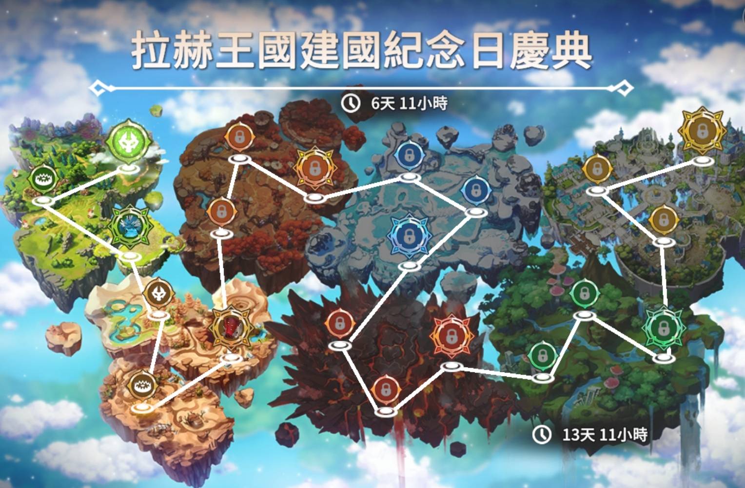 本次1周年活动新增节庆岛活动区域在拉赫王国建国纪念日庆典中,玩家可以透过入场露德林、特斯卡、艾亚、弗洛雷斯、洛克朗玛、库托纳、凯斯兰7个地图的地下城,获得收集1周年奖牌与丰富的虚宝资源!