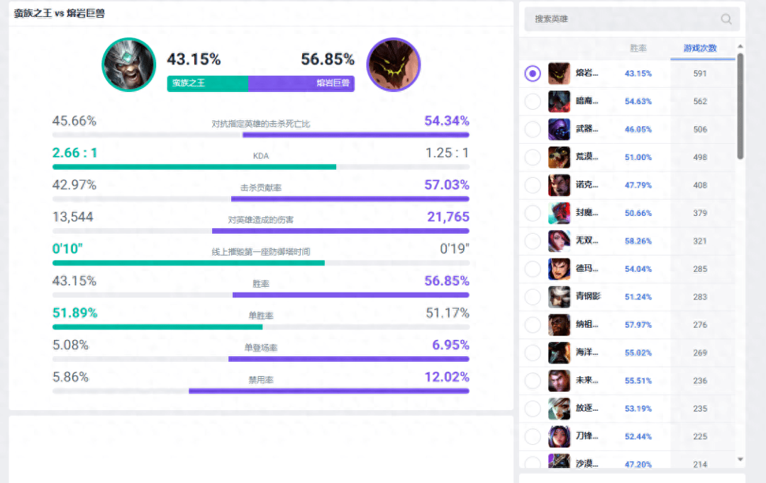 而在对线方面,还是和以往差不多。蛮王在对线大多数英雄的时候,都能保证胜率在50%以上,对线杰斯依然是爆杀。