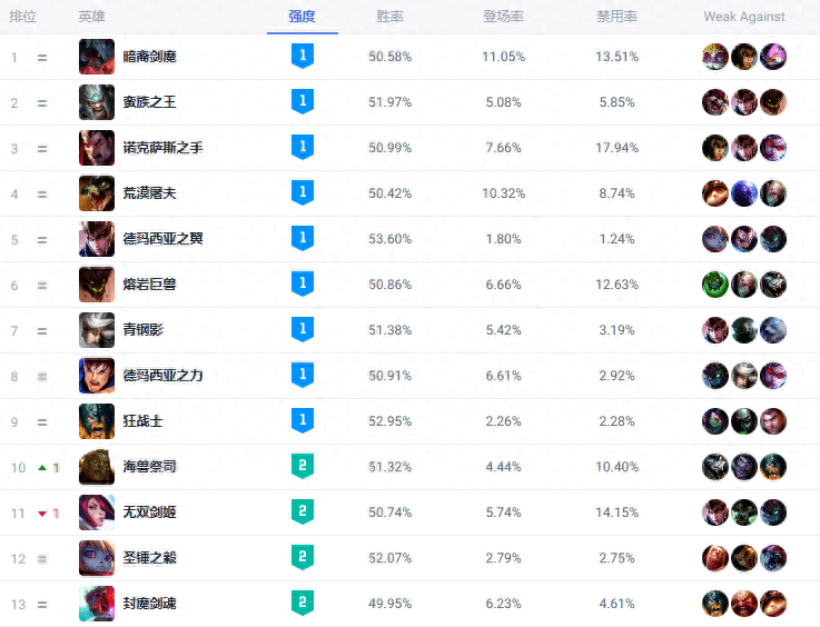 目前的OPGG榜单中,蛮王已经排在了上单位的第2名,不仅超过了诺手,更是比上个版本的版本之子鳄鱼还要高出一名。而上个版本的蛮王在哪里?又有多少人会在上个版本玩这个英雄?由此可见蛮王这个加强的幅度到底有多大。