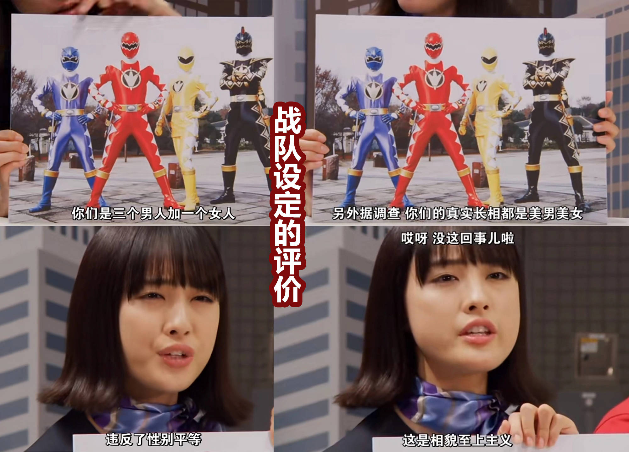 另外在这部《爆龙战队暴连者》20周年的剧场版中,还是有着很多让人忍俊不禁的画面,就在看两个比较经典的。首先就是关于他们战队配置的吐槽,他们是三个男战士加上一位女战士,这一点违反了性别平等。另外根据调查,他们的真实长相都是美男美女,这算是相貌至上主义,这一点多少有点夸奖他们。