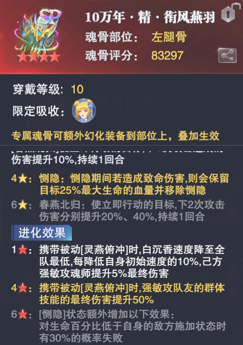 - 针对红色1星的提升最终伤害效果,维一个人表示其疑似带有bug,因为我用锤三+白沉香的二人组在好友对战中测试,没带香香进化魂骨时锤三的技能平均伤害为5.5亿,带了之后为6亿左右,而我的香香初始速度为340,锤三的初始速度为165,按照技能描述香香速度应该是降到了165一下,降幅应该达到初始速度的50%左右,增伤应该为25%左右,但其实战测试结果并非如此,所以维一怀疑这个虽速度降低而提升最终伤害的效果并未实装,而是只带有5%的初始最终伤害提升......