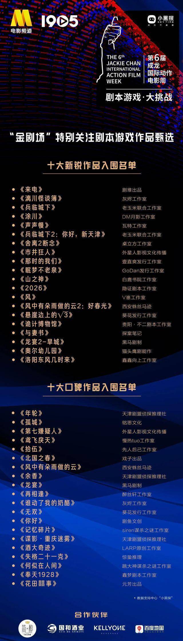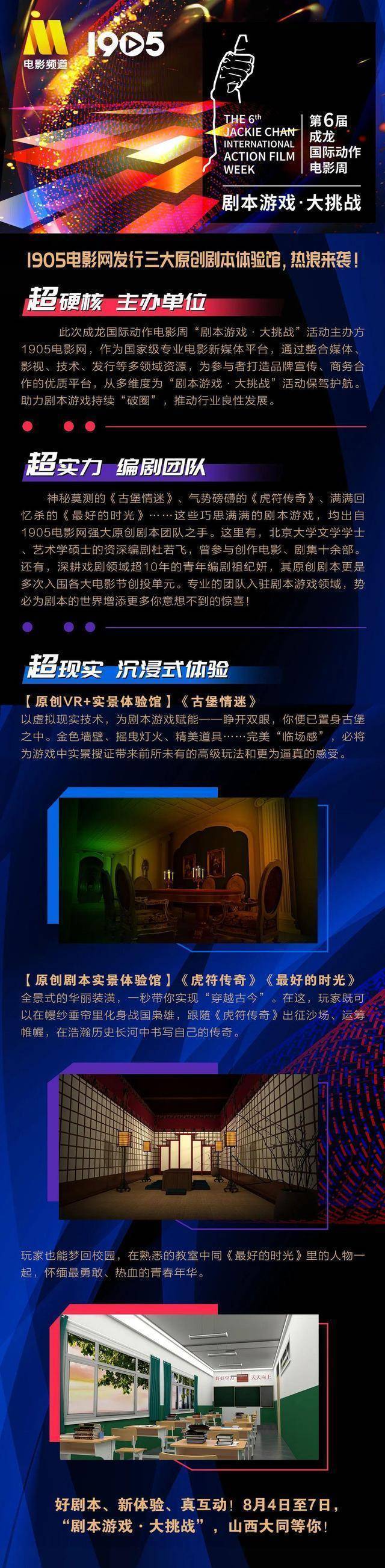 即将举行的成龙国际动作电影周期间,这些人气作品将亮相由1905电影网、大同广播电视台主办,奈何剧本杀联盟、北京华录新媒信息技术有限公司、一九零五(北京)技术服务有限公司、大同市尚瑞文化传媒有限责任公司合办的“剧本游戏·大挑战”活动,在山西大同代王府为剧本游戏行业呈现一场盛大夏日狂欢。