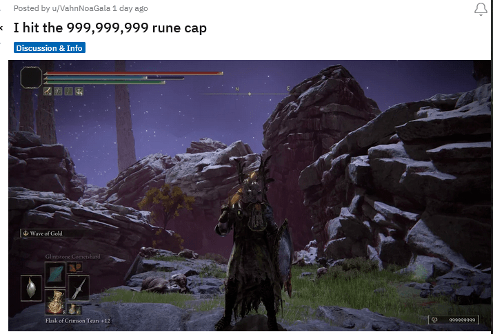 一位ID为 vhnnoagala 的Reddit用户分享了自己的截图,从中能看到他拥有了 999,999,999 个卢恩,已经达到了卢恩的拥有上限,而这些卢恩能够使角色从353级升到639级,但距离等级上限的713级还有一段时间。