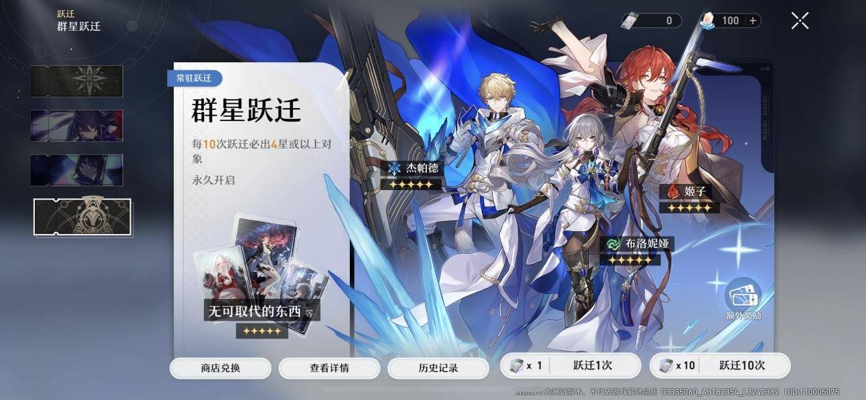 永久跃迁,主要抽五星角色和五星光锥,九十次跃迁保底,次要出四星角色和三四星光锥。