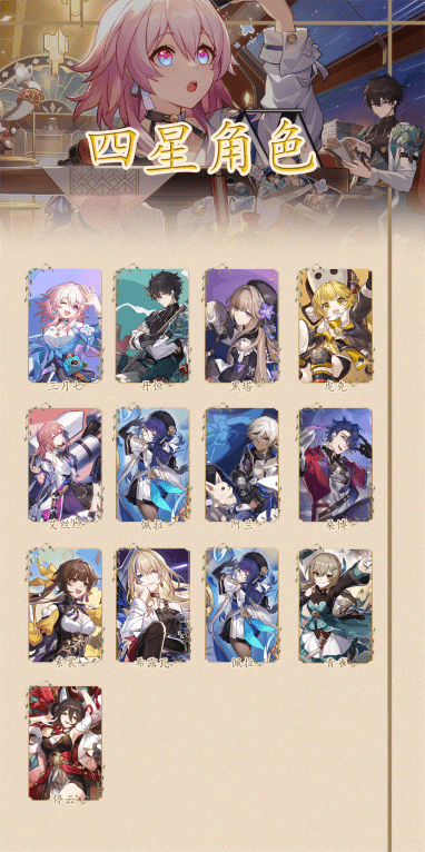 四星角色:三月七、丹恒、黑塔、虎克、艾丝坦、佩拉、阿兰、桑博、素裳、希露瓦、佩拉、青雀、停云