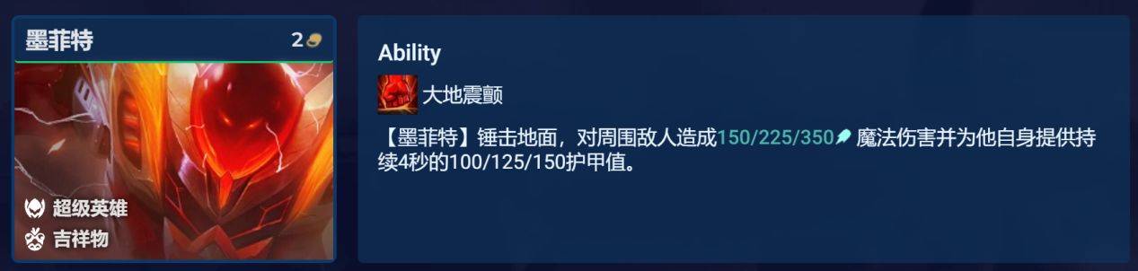 另一方面墨菲特这版本也获得了大提升,初始生命值增加100点,3星下比之前多增加了324生命值,生存能力变得更高;其技能伤害也大幅度增加,3星增加25点魔法伤害。