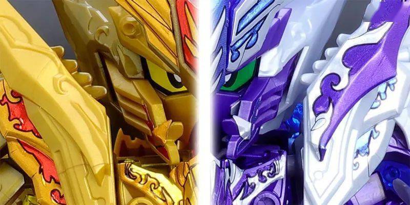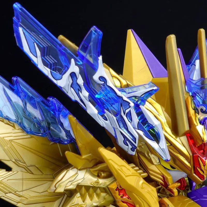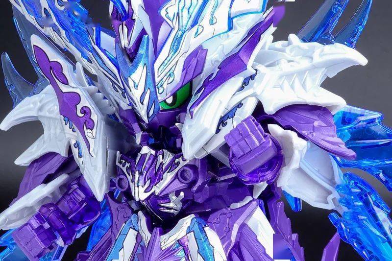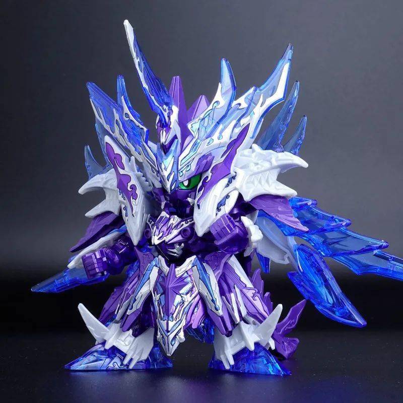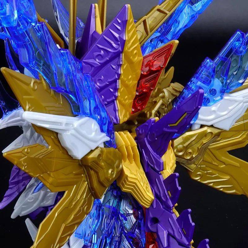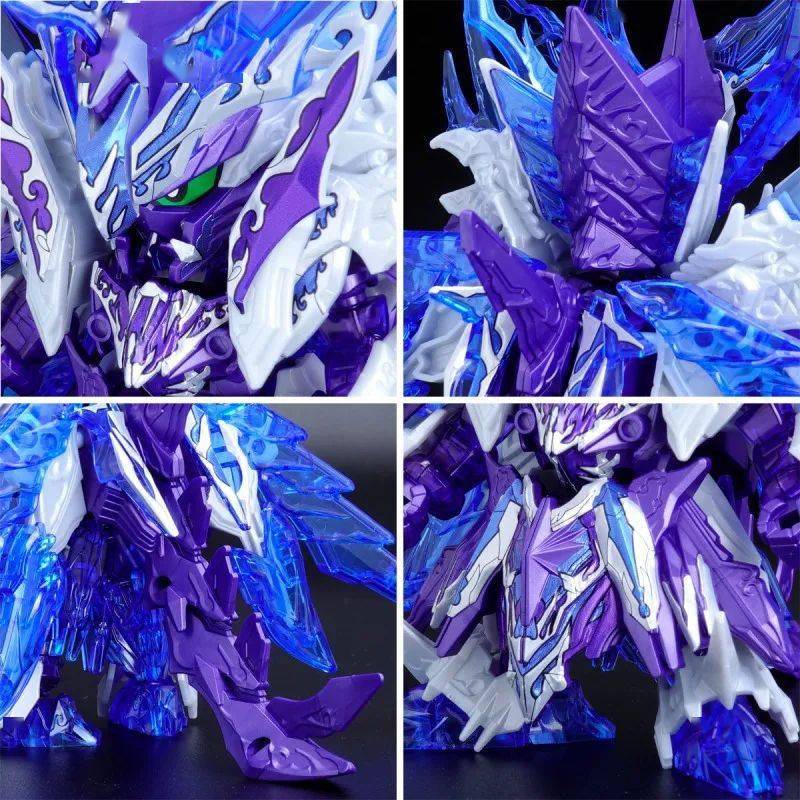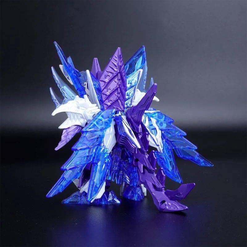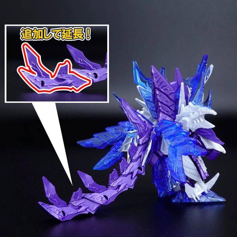 这款组装模型套件运用金属紫、金属银、透明紫、透明蓝等成形色零件与补色贴纸再现由术士神盾高达与黑暗霸者龙合体而成的无限正义异变龙,呈现如同水晶般辉煌而神秘的色调,表现他兼具灾祸感与神性的形象。