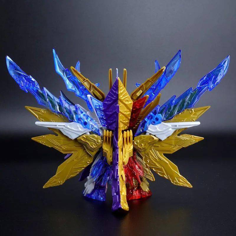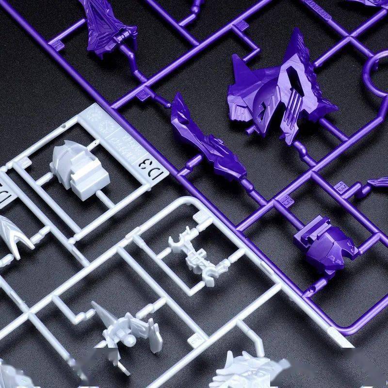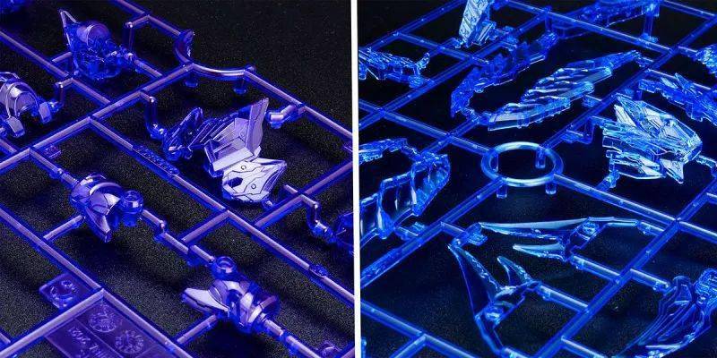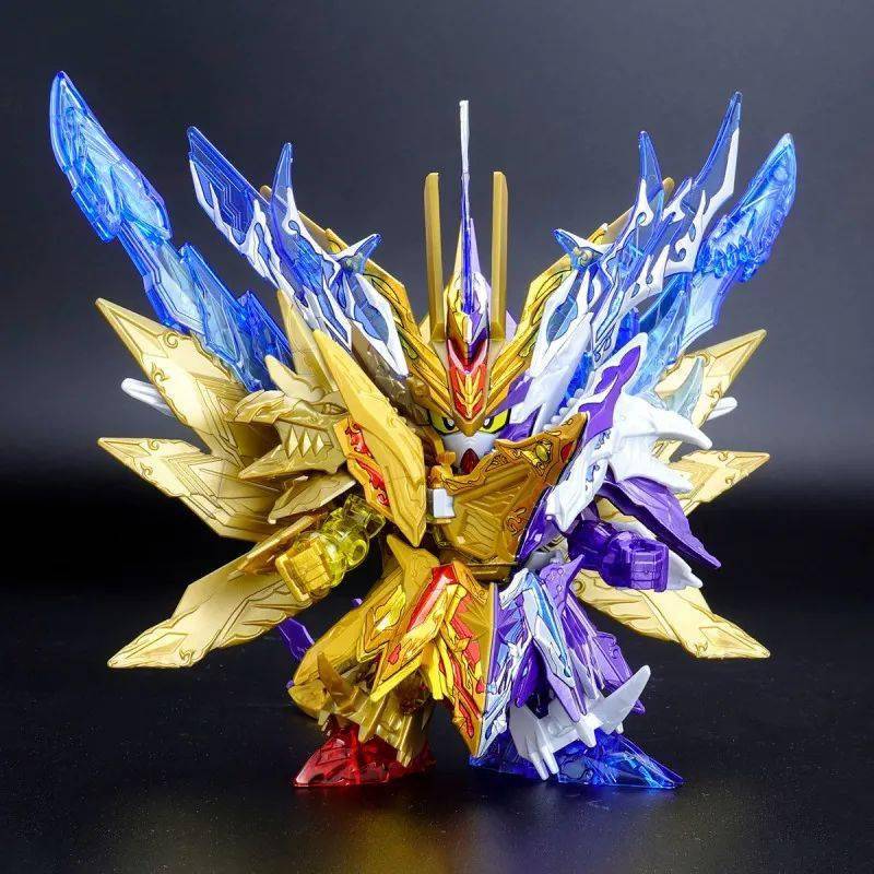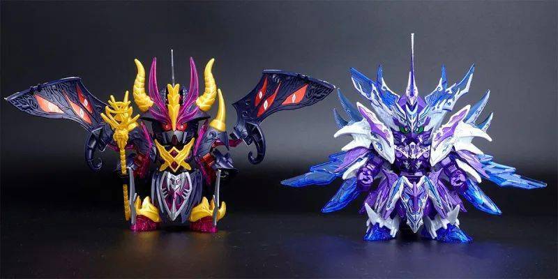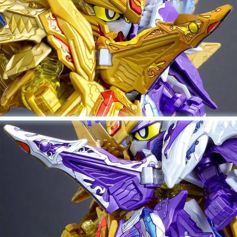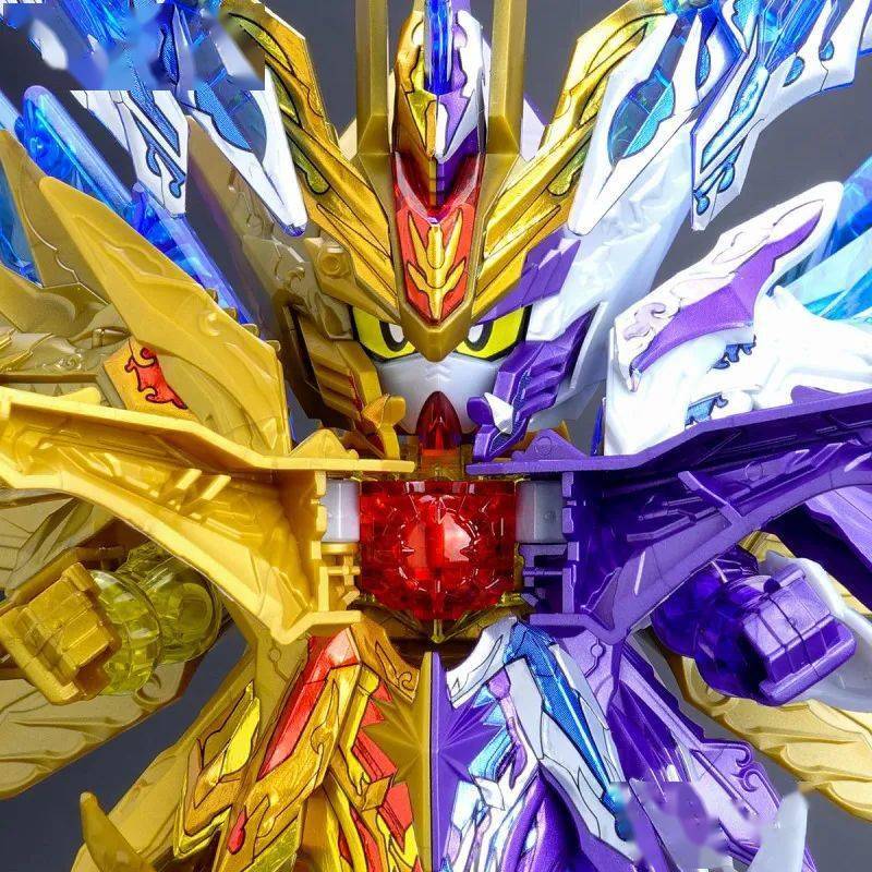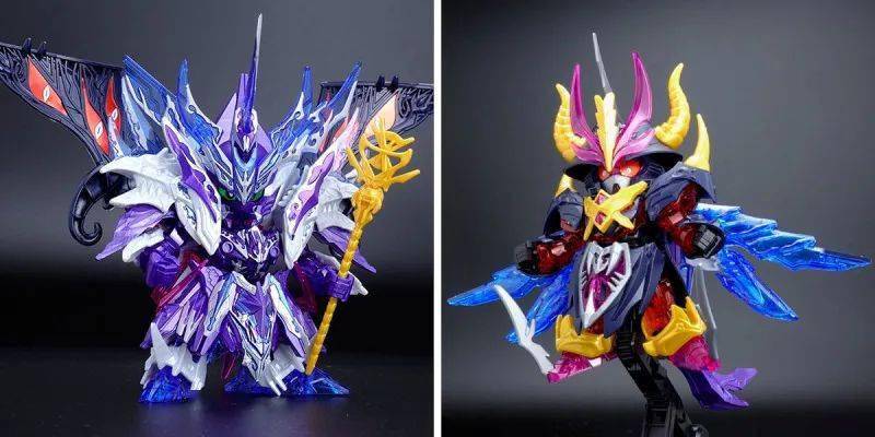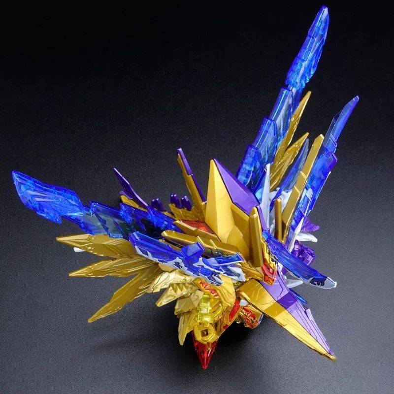 这款组装模型套件运用金属紫、金属银、透明紫、透明蓝等成形色零件与补色贴纸再现由术士神盾高达与黑暗霸者龙合体而成的无限正义异变龙,呈现如同水晶般辉煌而神秘的色调,表现他兼具灾祸感与神性的形象。