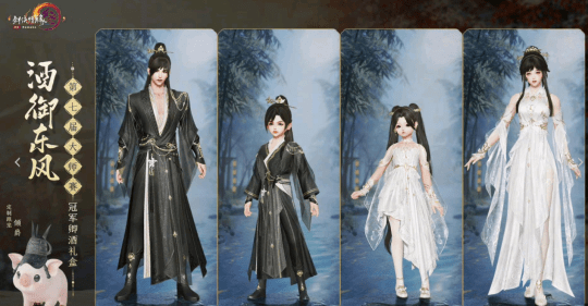 卿酒俱乐部在上次获得大师赛冠军后,也就诞生了这款外观。成女束起的长发显得优雅而又干练,雪白的长裙点缀着金色的装饰和战队队标,既不那么单调,又增添了几分尊贵。而成男则是以黑金为主题,同样是雍容华贵的路线。
