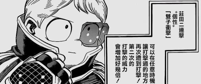 庄田这个角色虽然很容易被人忽略,但他在这一轮的表现其实很不错。庄田虽然很低调,但他确实是本轮B班最重要的核心位置,不仅是双智囊之一,还是主力战斗员。二连击的是B班重要的攻击手段,柳灵子和小大唯在他的配合下组成了炮台三人组,物间也复制了他的个性对绿谷进行了有效攻击。