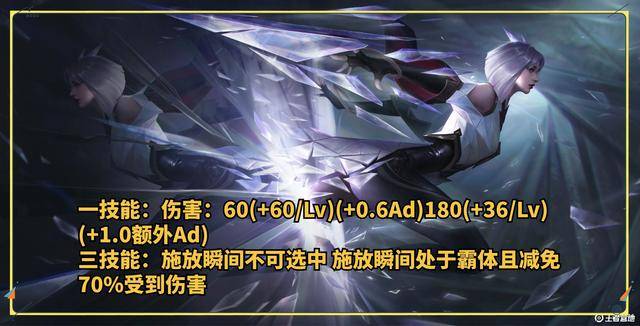 基础伤害原本只有60点,现在翻了三倍,变成180点,虽然说每级成长下调了24点,不过也新增加了一个额外的AD加成,所以一技能伤害真的变高了很多。