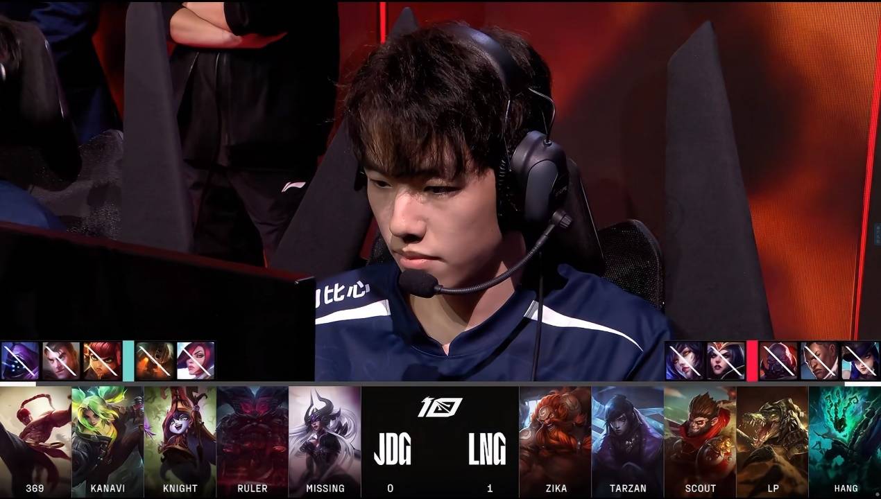 比赛开始后,JDG下路拿到推线权,上路LNG鳄鱼优势,Tarzan尝试Gank失败,但随后Zika鳄鱼来到中路配合Scout先手E闪击杀了辛德拉,Knight出现失误没用闪现。