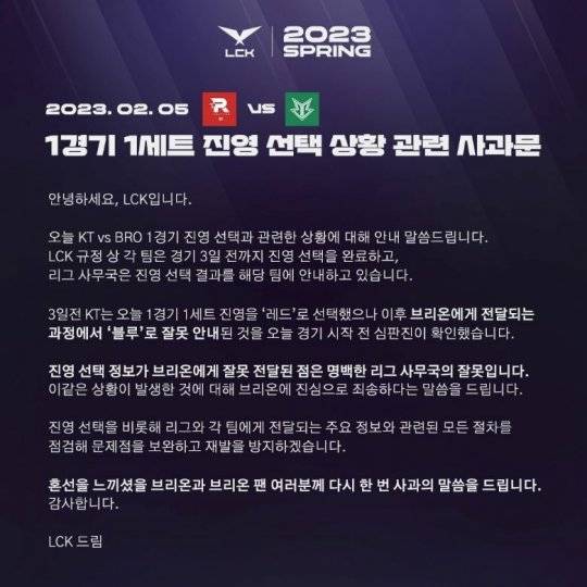 这件事最早得追溯到2月份的比赛,彼时对阵双方分别是KT和BRO。可在比赛开始前40分钟,LCK赛事官方突然告知BRO,原本的红蓝选边因为裁判的失误被反转过来了。由于临时更改来不及,所以赛程只能继续推进。