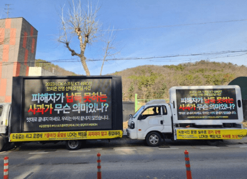 而在近期,首尔街头又出现了BRO粉丝包下的卡车,但他们针对的却不是战队而是赛事官方。卡车上的标语显示:“2023LCK春季赛KT-BRO比赛,BRO选边事件。受害者不能接受的道歉有什么意义?别随便了,我们还没有结束。”