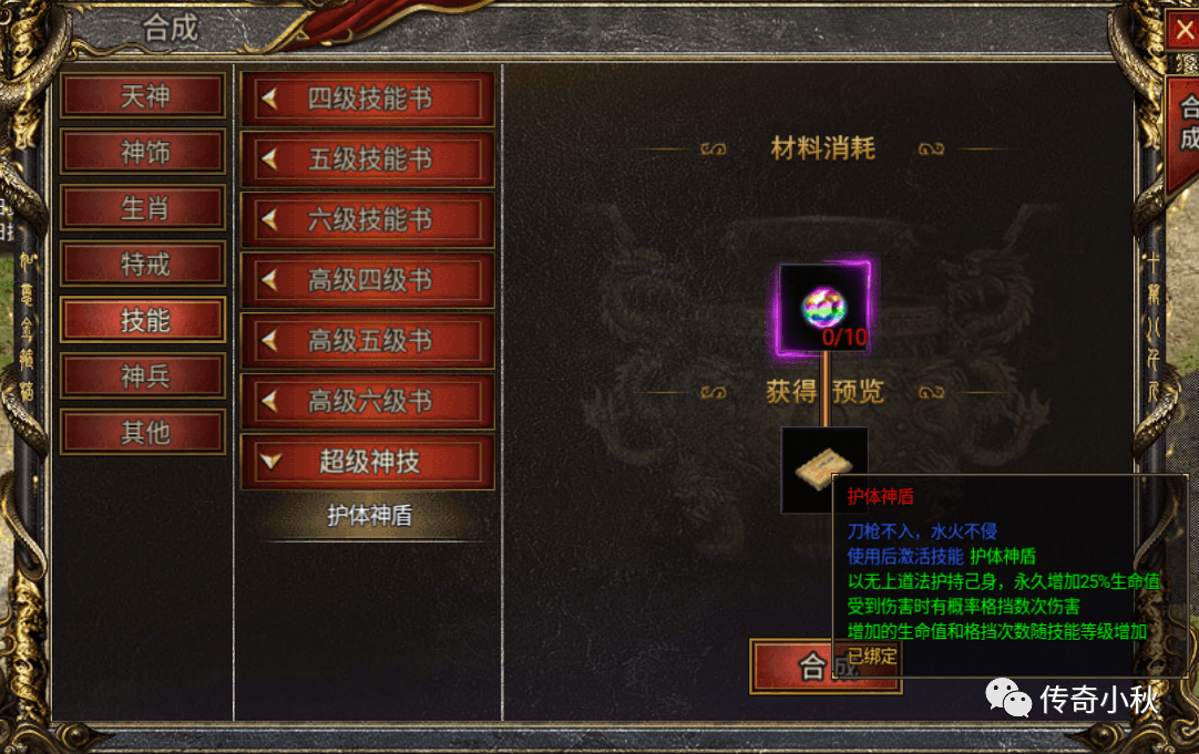 护体神盾在游戏里属于超级神技一类,刀枪不入水火不侵。永久增加百分之25生命值,受到伤害有概率格挡,非常bug,称得上是超级神技。想学到他需要10个至尊宝石。至尊宝石可以在每日充值里签到,一个月签满可以获得2个。就是说需要5个月。还可以在商场里用灵符购买(土豪可以买因为价格比较高)