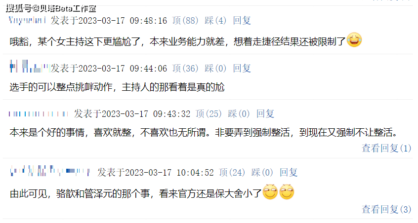 有人直言骆歆以后尴尬了,本来业务能力就不行,现在也没有捷径可走了。还有人认为是骆歆和管泽元事件之后,官方选择站队管泽元了。也有人认为选手可以整点出场动作,主持人确实没必要,很尴尬。更有人直言:想整活就整活,不想做动作就不做,没必要非常强制别人。