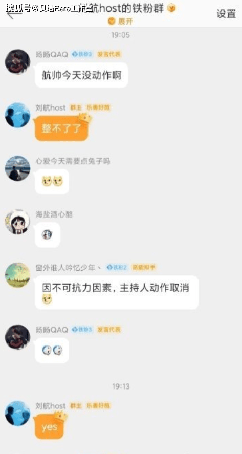 刘航在粉丝群里的发言如下,因为这场比赛开场的时候没有做开场动作,于是粉丝群里有粉丝询问这件事情,刘航一开始还委婉表示:整不了了。之后有粉丝回应:因为不可抗力因素,主持人动作取消。刘航直接回复:yes。