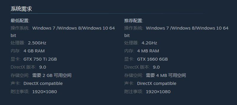 ▲ 内存要求为 4GB,商店页面写错了游戏介绍: