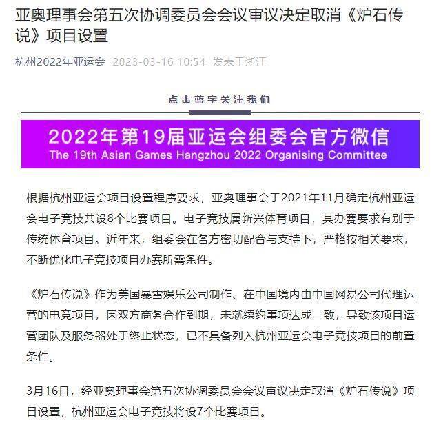3月16日,经亚奥理事会第五次协调委员会会议审议决定取消《炉石传说》项目设置,杭州亚运会电子竞技将设7个比赛项目。