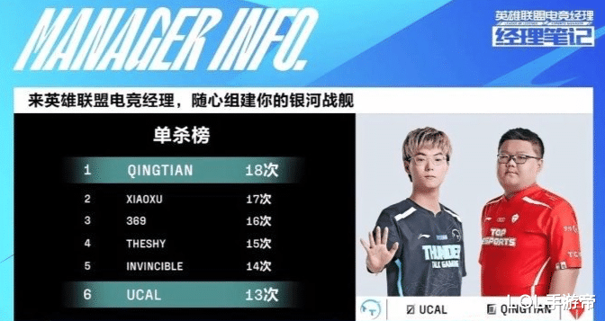 有意思的是,在赛前,LPL官方公布了本赛季的单杀名单。TES上单Qingtian以18个单杀高居榜首,TT中单Ucal以13个单杀排名第六。