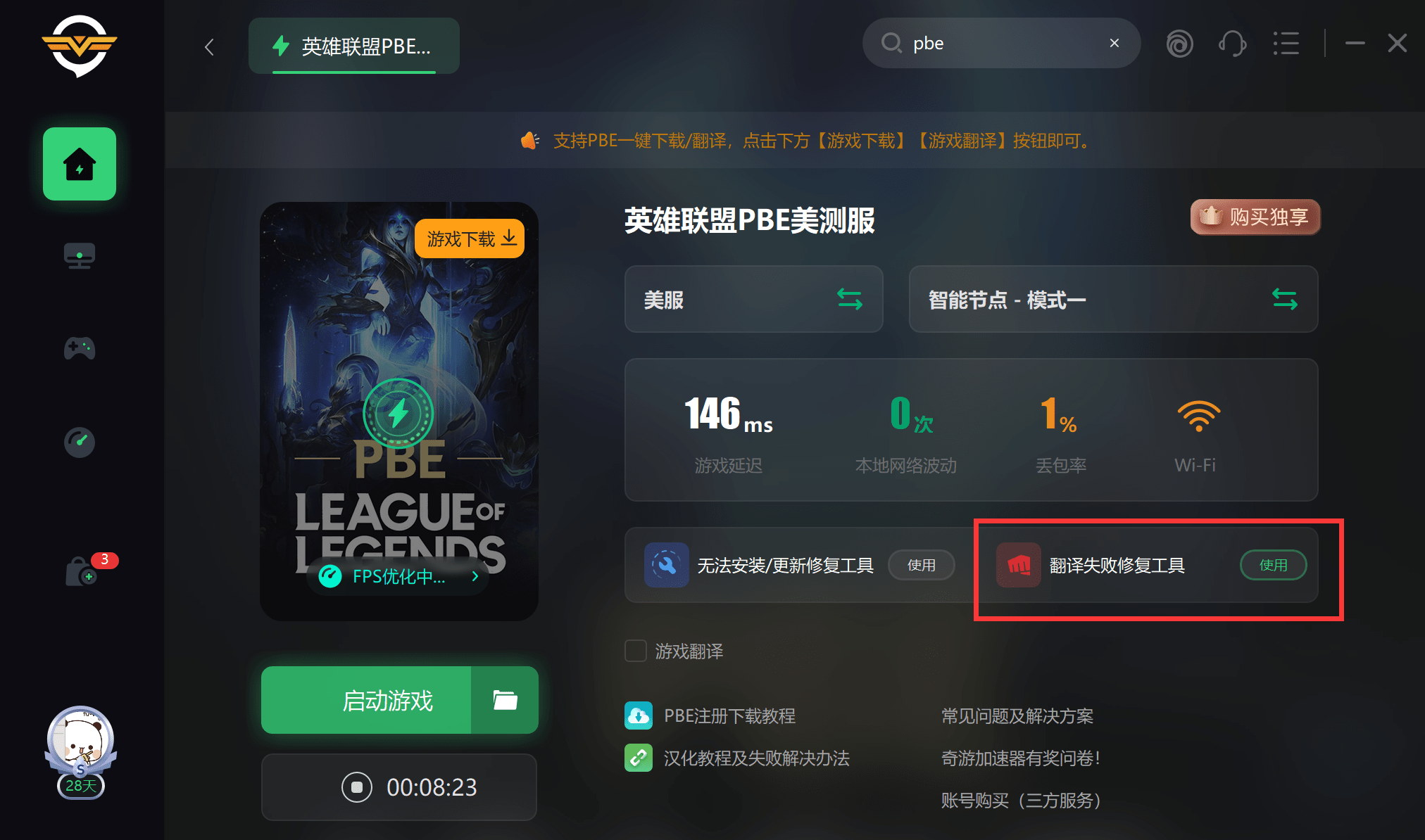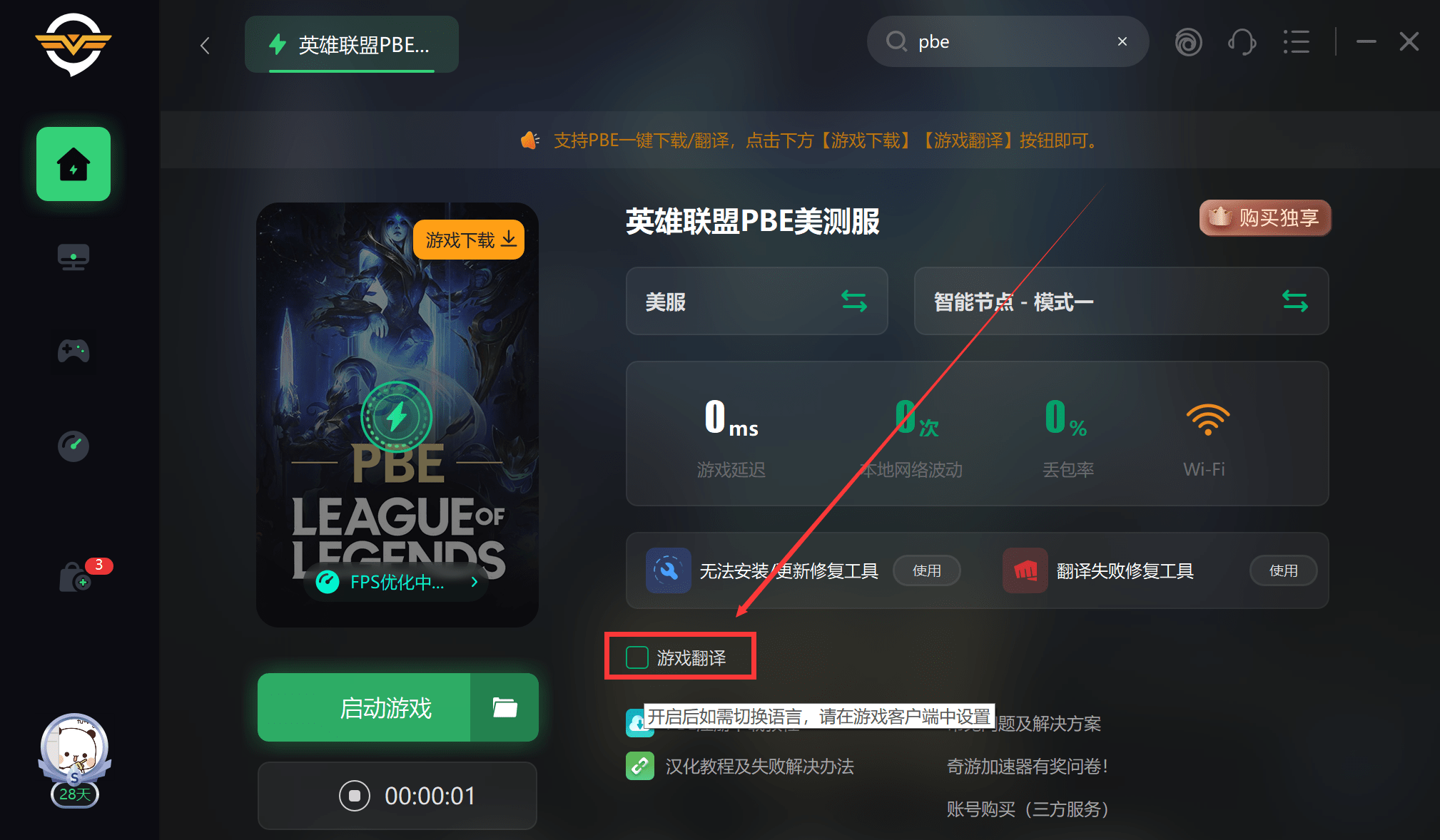 在游玩PBE时,加速是必须的。奇游不仅具有加速效果,还支持一键汉化功能,可以帮助玩家直接将客户端汉化。玩家们只需要在奇游的加速界面勾选游戏翻译再启动游戏即可。