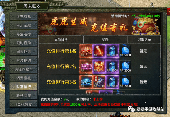 每周5-7三天都会有财富排行,根据充值来排名,排名第一的奖励最多,有一个PK伤害加成2%的称号,其他属性也非常好,还有一把金蛇战装的武器部位,以及生肖精石和钻石。