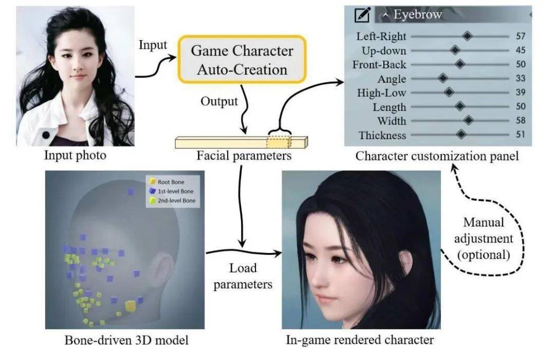 网易的AI实验室“伏羲”也最早于2017年上线,主攻AI在游戏与泛娱乐当中的应用研究。如今伏羲在NPC行为、语音、美术等方面已经运用于网易旗下多款游戏之中。如上文中提到的米哈游“AI配音”功能,网易也通过伏羲在自己的游戏《时空中的绘旅人》中实现。而在3月14日,伏羲又宣布其“文本捏脸创建角色”相关论文入选CVPR接收名单,并已应用于多款手游。