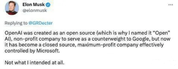 曾经的OpneAI创始人之一马斯克(现已退出)近期多次发声怒斥ChatGPT“放弃了开源、被微软控制”。他的发言得到了大量支持,或许正是源于人们害怕技术被大公司垄断的危机感。当然评论区也有人提醒:马斯克自己就是一个大企业主,他可能只是遗憾于自己错失了垄断的机会。