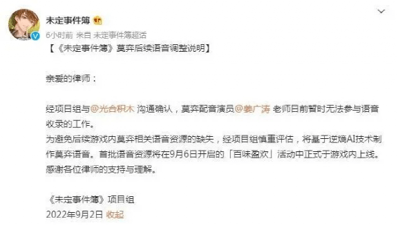 像秉持“技术宅拯救世界”的米哈游很早就在拥抱AI。2022年9月旗下游戏《未定事件簿》就用逆熵AI实现了“用AI配音取代真人配音演员”。