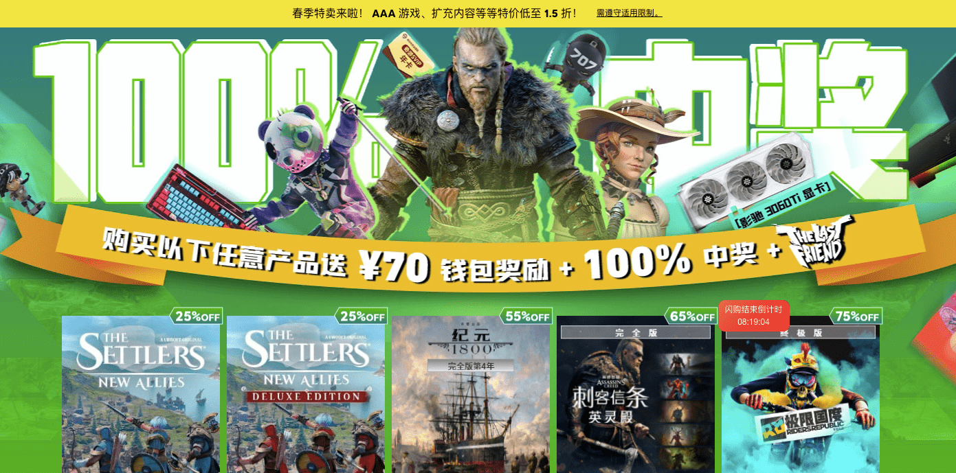 随着Steam大促方案改制,其实打折活动在每个季节都会有一次,要是相中的游戏没有很大的优惠,也可以等下次大促再购买。不过育碧这次有送游戏的活动,感觉还是可以冲一下的。