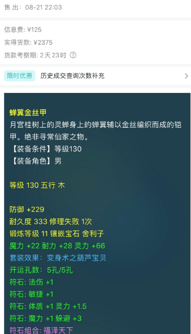 这位玩家于一年前购买的蝉翼金丝甲在前段时间售出,虽然装备耐久度已经有所下降,不过卖出的价格却有所提升,作为游戏散户的装备宝宝们在感受了一年装备所带来加成的同时还能有所收益,将其称之为网游史上的奇迹可以说是毫不为过。