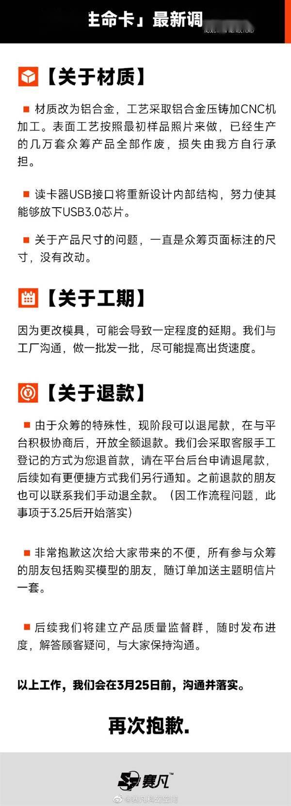 现在,赛凡官方公布了《流浪地球2》数字生命卡产品的调整声明,对产品材质、工期、是否能够退款等用户在意的内容做出了回应。