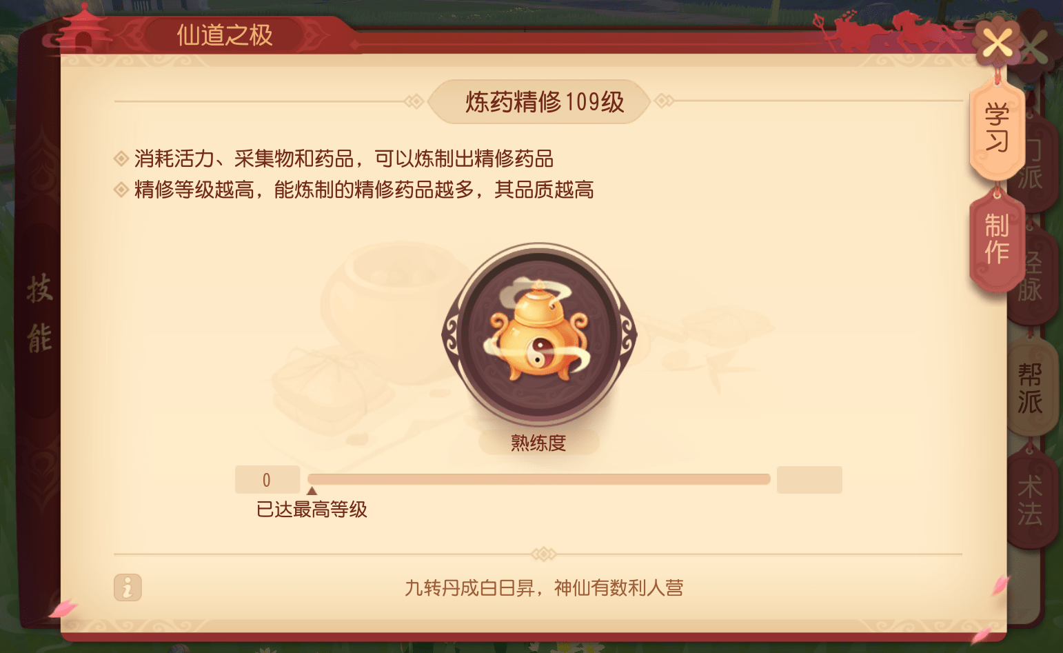 刚开始的新手不用执着于精修,毕竟精修需要花费的人力财力时间可想而知,并不适合新手;大家可以着力于提升帮派技能等级及采草/捕猎熟练度,这样之后接触精修也比较顺畅。