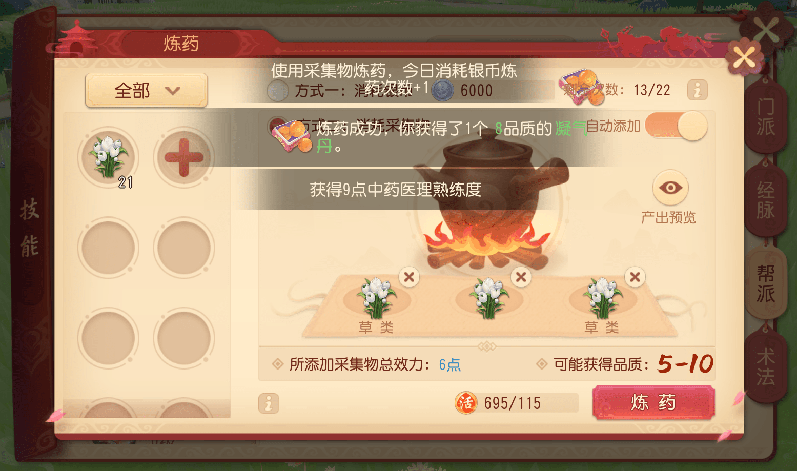 值得注意的是,使用采集物炼药还有40%的概率增加一次银币炼药次数,也会获得中药医理熟练度。虽然有点耗时,但还是比较推荐新手选择这一方法的。