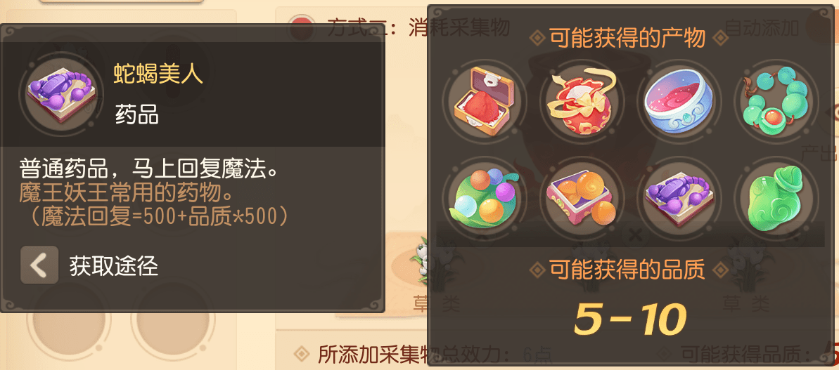 这种方式炼出的药品品质与所放入的采集物等级有关,采集物的等级越高,炼出的药品品质越好,也有可能轻轻松松炼出极品【蛇蝎美人】等药品!