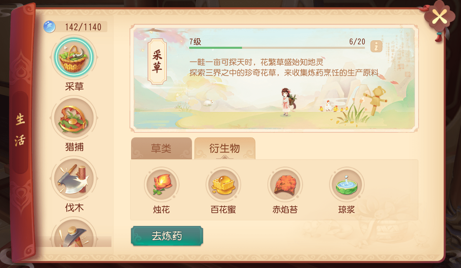 选择消耗【采集物】炼药,需要先前往【采药】收集采集物。少侠可前往【制造】-【生活】进入【采草】页签,获取对应采集物的地点。