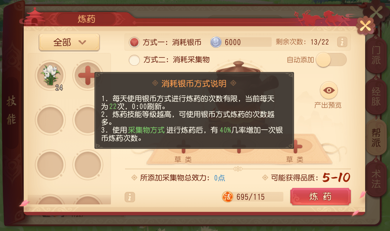 少侠点击【炼药界面】即可进行普通炼药,普通炼药消耗【银币】或【采集物】。