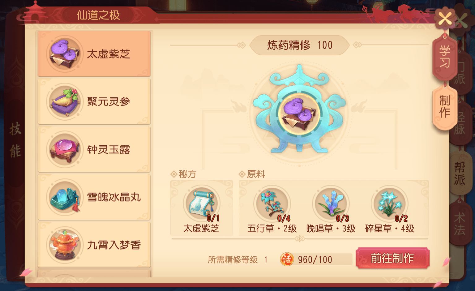 大家要想提高炼出的药物品质,除了提高帮派技能等级,也可以多去野外采药,提高采药等级,从而获取高品质采集物进行炼药。