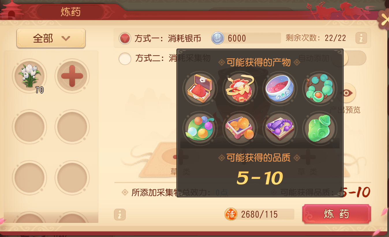 选择消耗银币炼药可不放入采集物,每天使用银币炼药的次数有限,炼药技能等级越高,每天可使用银币炼药的次数越多。由于银币炼药产出的药品较为随机,运气好的话药品品质可达10级,这个操作全看少侠手气。