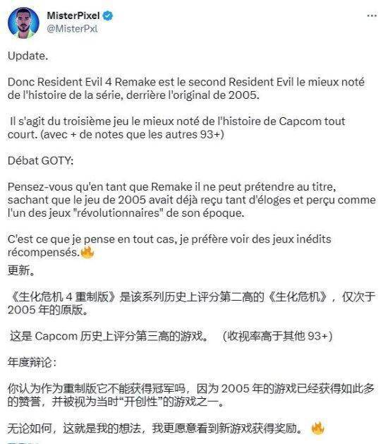 今日,《生化危机4:重制版》媒体评分解禁,M站均分94分。推特用户MisterPxl表示,《生化4RE》是《生化危机》主线作品历史上评分第二高的游戏,仅次于2005年的原版。