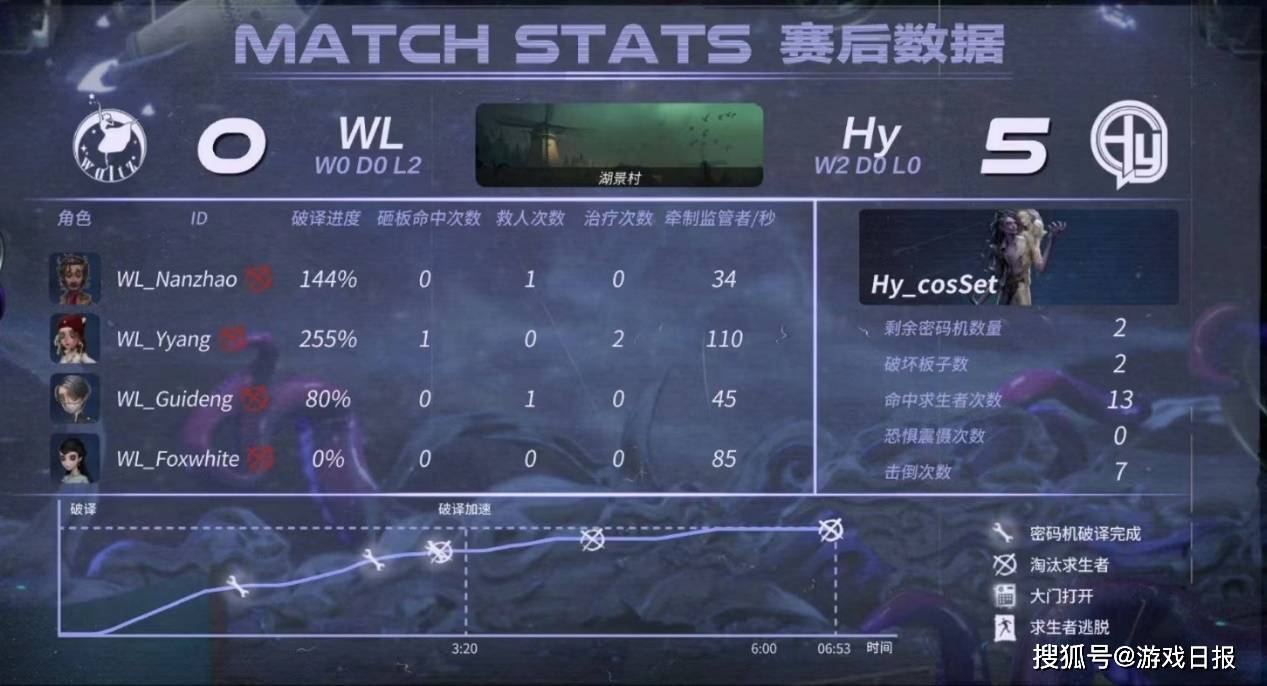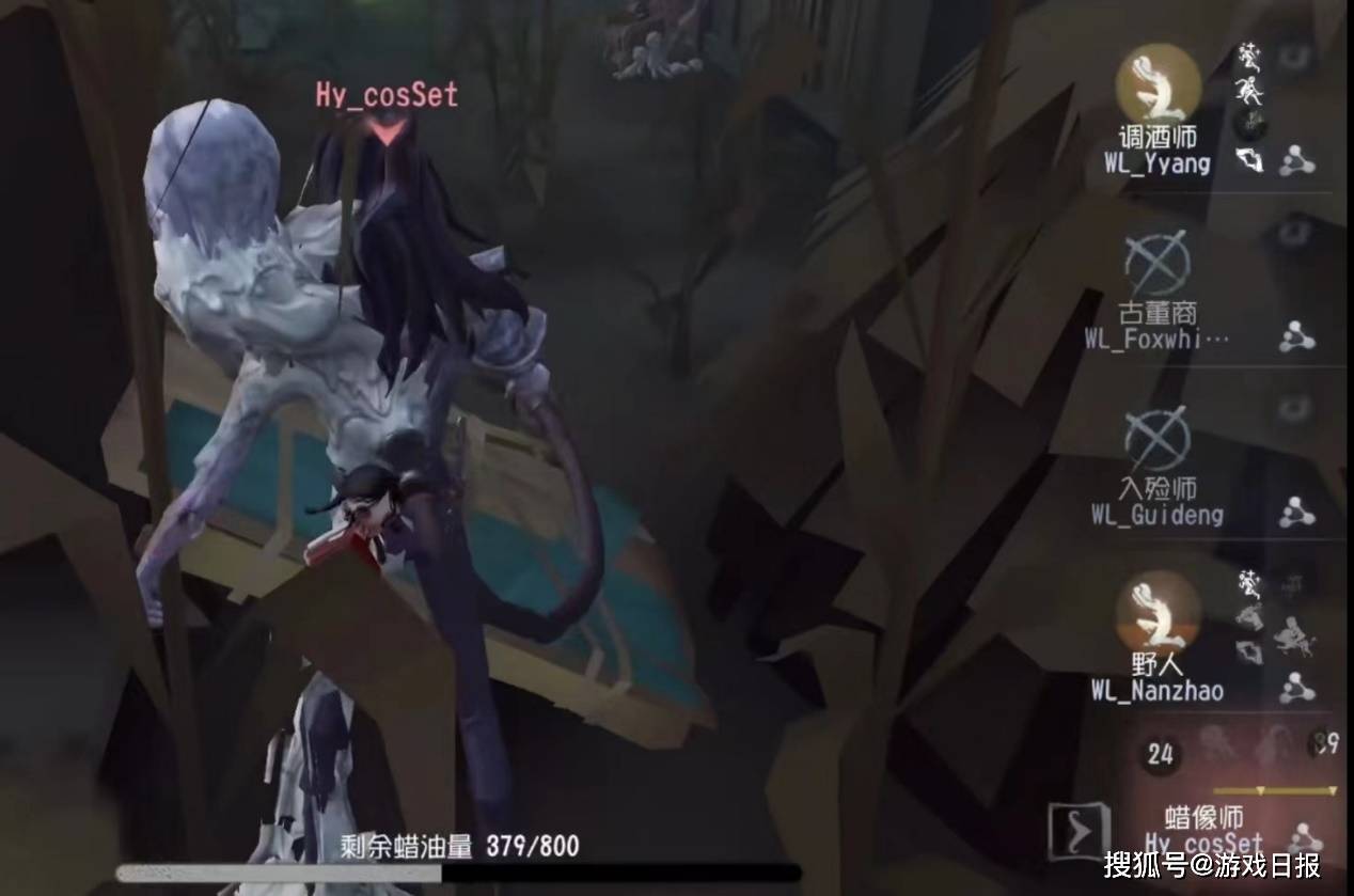事实上,严格来说蜡像师算是追击型监管者,其蜡油控制以及封窗封板等均利好追击。但是在赛场上,众多监管者选手却利用亮眼实战向观众展示出,蜡像师可以全能:封机、二阶双刀能力全面;他也必须全能:战场后期局面瞬息万变,要求这一追击型监管者必须在守椅、控场方面也打出效果方能获胜。第二局下半局,Hy_cosSet轮换上场,其全能型蜡像师表现堪称教科书级别。
