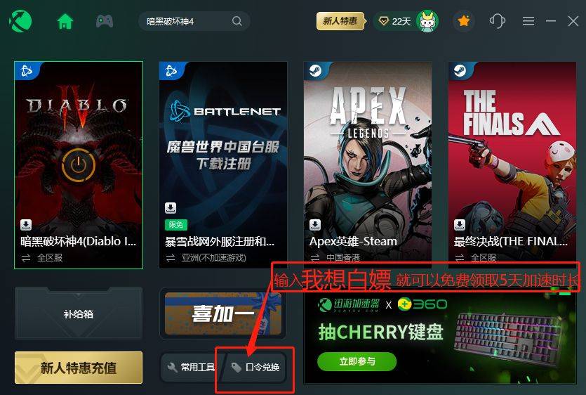 在这里推荐大家使用迅游加速器,现在可以免费体验,我们打开迅游加 速器,只需要在口令兑换处输入【我想白嫖】就可以免费领取5天加速时长。然后搜索暗黑破坏神4,然后点击加速就完成了。