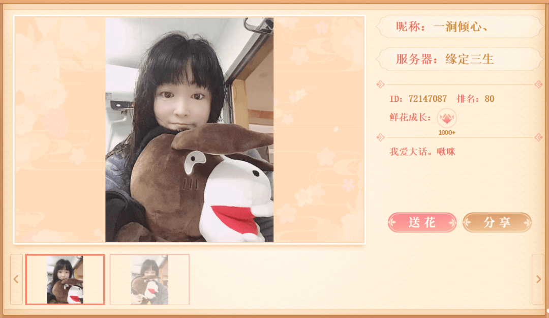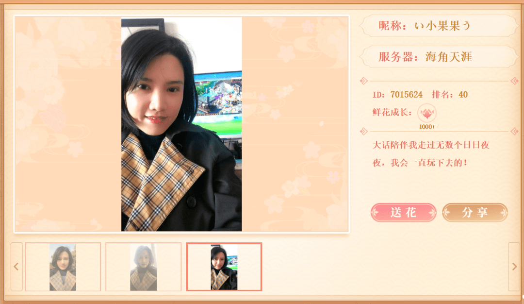 我来自缘定三生服务器千秋盛世帮派,我喜欢跟队友一起杀星,修罗,一条任务,总之就是和队友在一起就很开心,上游戏就把其他的烦恼都抛之脑后了。在这里我也想感谢我的队友,我的“芊芊”宝子,感谢大话这款游戏让我认识了很多的朋友,第一次参加【佳人有约】活动,希望大家多多支持!祝大话西游越来越好!