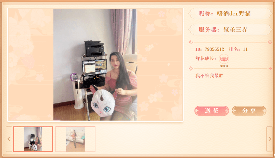 我来自聚圣三界服务器同舟共翼帮派,我很喜欢PK,无论是帮战还是其他比赛我都会参加,我觉得PK很刺激,尤其逆风翻盘的时候很有成就感!感谢一路走来相伴的朋友们,也感谢大话让我认识到各行各业的朋友,最后祝大话西游越做越精美,越来越好。谢谢支持我的小哥哥小姐姐们,猫儿再次感谢各位的厚爱!