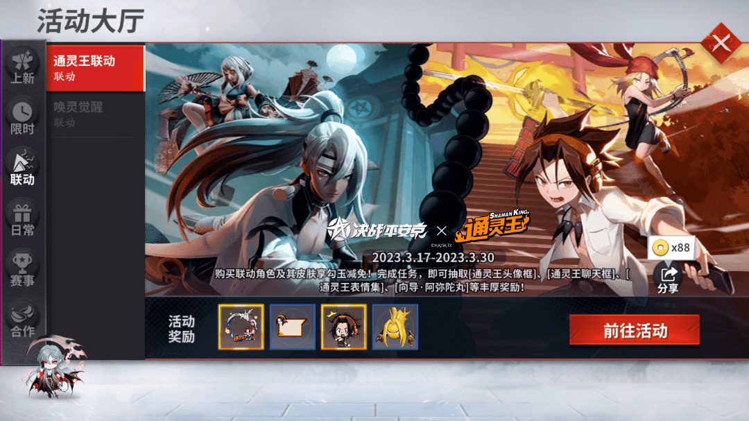 《决战!平安京》× TV动画《通灵王》联动再次开启,联动角色 「麻仓叶」、 「恐山安娜」限时返场! 麻仓叶珍藏皮肤「挚守之忆」、 恐山安娜珍藏皮肤「逐风之约」、通灵王联动礼盒 [灵战补给]限时返场。完成活动任务,还可领取 联动活动专属奖励,请勿错过哦~