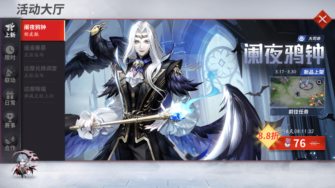 活动期间,穿戴 大司命史诗皮肤「阑夜鸦钟」完成指定任务,即可获得 [祈福绘马]、 [回城咒印幸运礼盒]、 [金币福袋]等奖励!