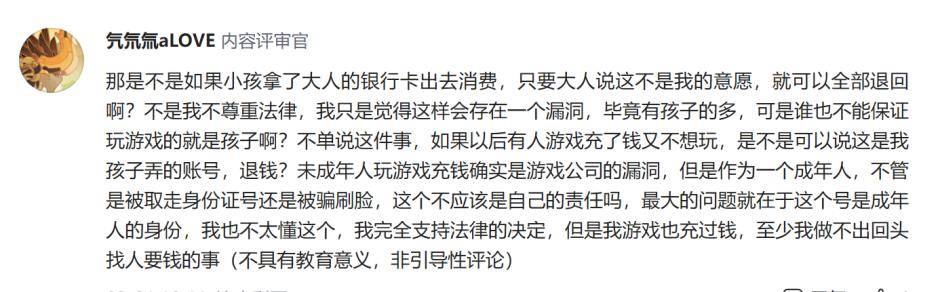 更有网友表示:游戏公司应该慎重处理未成年人充值退款的问题,如果每次遇到申诉就轻易退款,又会造成“大人充值后,假借未成年人的身份和意愿申请退款”的漏洞。