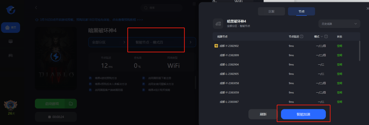 加速完成之后如果还是无法进入游戏,很有可能是因为此加速节点使用的人数太多了。很多玩家挤一个节点会导致延迟很高的情况出现,这个时候我们就可以使用海豚加速器的更换节点功能,点击智能节点,选择延迟最低的节点进入游戏即可;