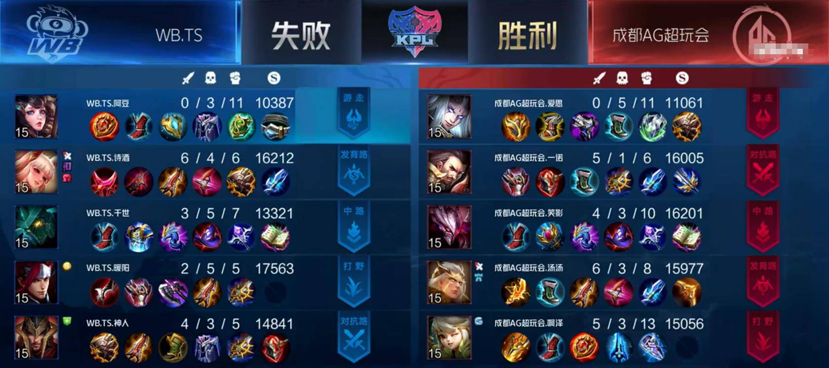再来拿暖阳来举例,暖阳作为KPL中最强势的打野选手之一,他手中的韩信就是最好的证明,这是KPL中TS对战AG的一场比赛,看一下这赛后的数据面板,你还能说韩信不需要经济?